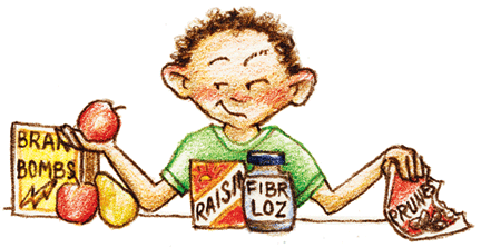 Behavior and dietary changes are vital to recovering from constipation. Record all stools on a chart. Try to schedule regular meals and decrease snacking to allow a natural reflex to stool after meals. Designate multiple times in the day to sit on the toilet for 5 minutes. Most children are too busy to “wait” and need to be reminded to try to have a bowel movement. Use rewards for stooling, avoid punishment and let them know what you expect. For young children, a statement such as “The poop wants to come out and go down the waterslide” often receives a giggle and decreases the tension. “Did I hear a toot?” often gets a smile and the child then tries to pass gas for fun (which gets her pushing). Good high fiber food choices include: